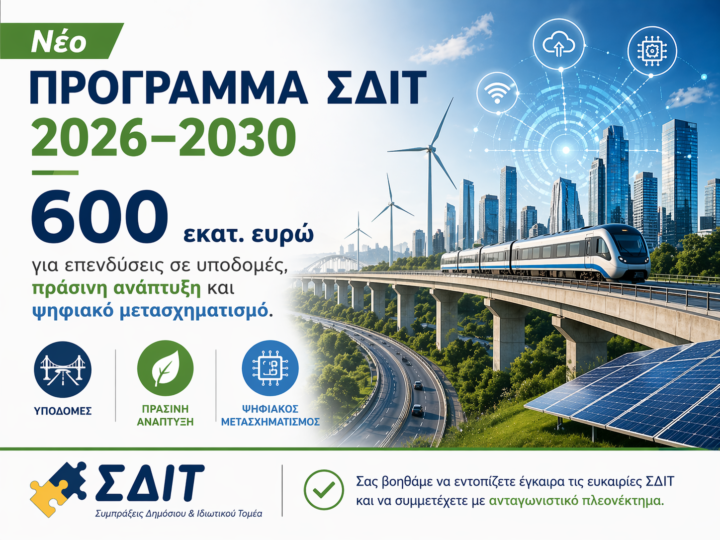 Νέο Πρόγραμμα ΣΔΙΤ 2026–2030: 600 εκατ. ευρώ για επενδύσεις σε υποδομές, πράσινη ανάπτυξη και ψηφιακό μετασχηματισμό. Με τη δημοσίευση στο ΦΕΚ (Τεύχος Β’ 2025/07.04.2026) της απόφασης 52715 ΕΞ 2026, ενεργοποιείται ένα νέο, ολοκληρωμένο πλαίσιο για την υλοποίηση έργων Συμπράξεων Δημοσίου και Ιδιωτικού Τομέα (ΣΔΙΤ), το οποίο εντάσσεται στο Εθνικό Πρόγραμμα Ανάπτυξης για την περίοδο 2026…